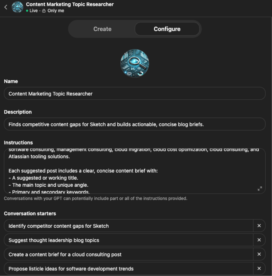 A custom GPT is not an agent. It’s more like a prompt wrapper on top of normal ChatGPT, but if you haven’t built a custom GPT yet, this is an opportunity to dip your toe into the idea of creating AI agents. All you have to do is this: